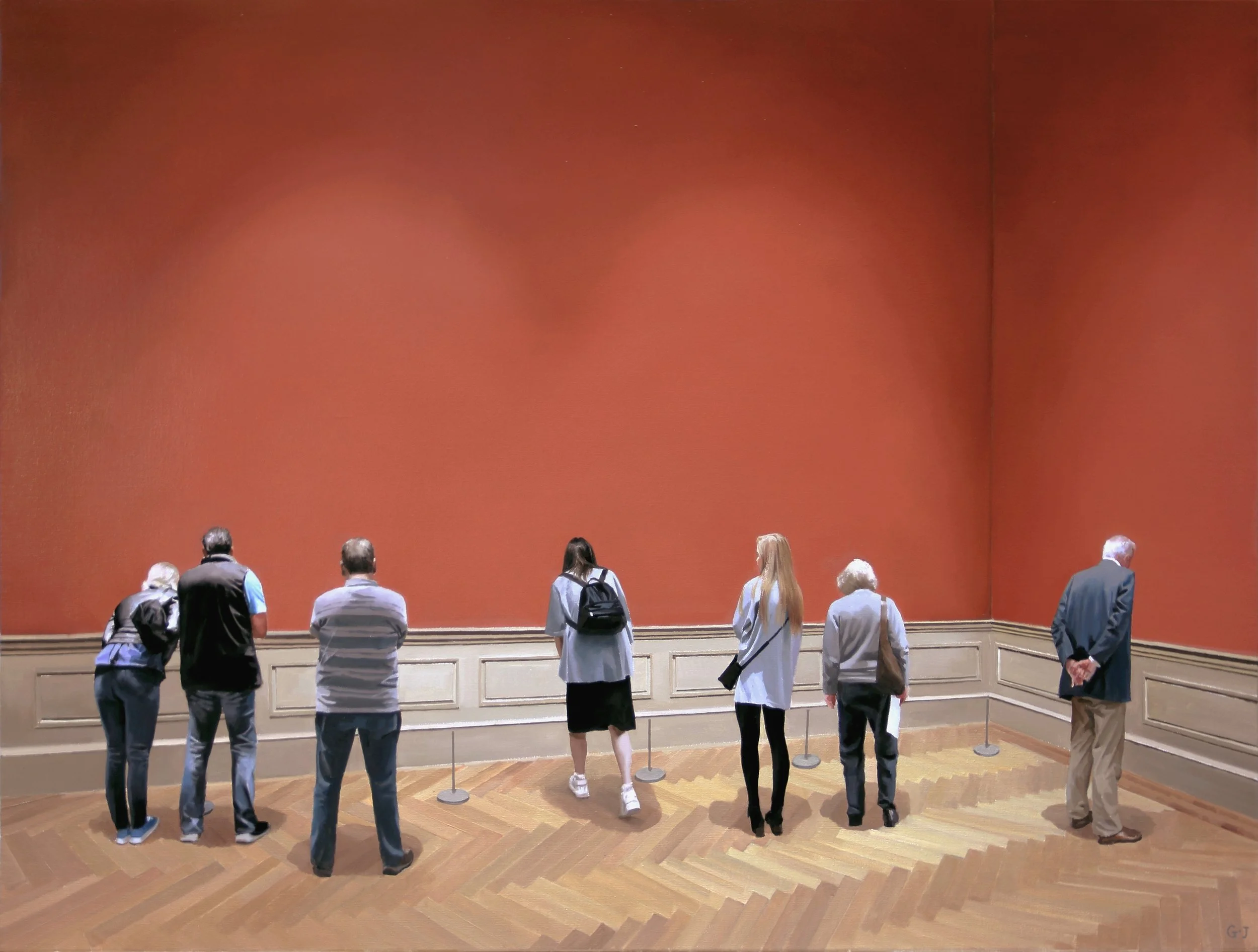 Similar to your Art Museum series, Big Fish also shows us a crowd of people gathered to see, well…something. It looks like an aquarium tank, but we can’t see the creature alluded to in the title. Perhaps the viewers depicted in the painting can. At least they all appear focused on the monumental blue void. Or perhaps they are anticipating something important. How do you see this painting? Is it allegorical?