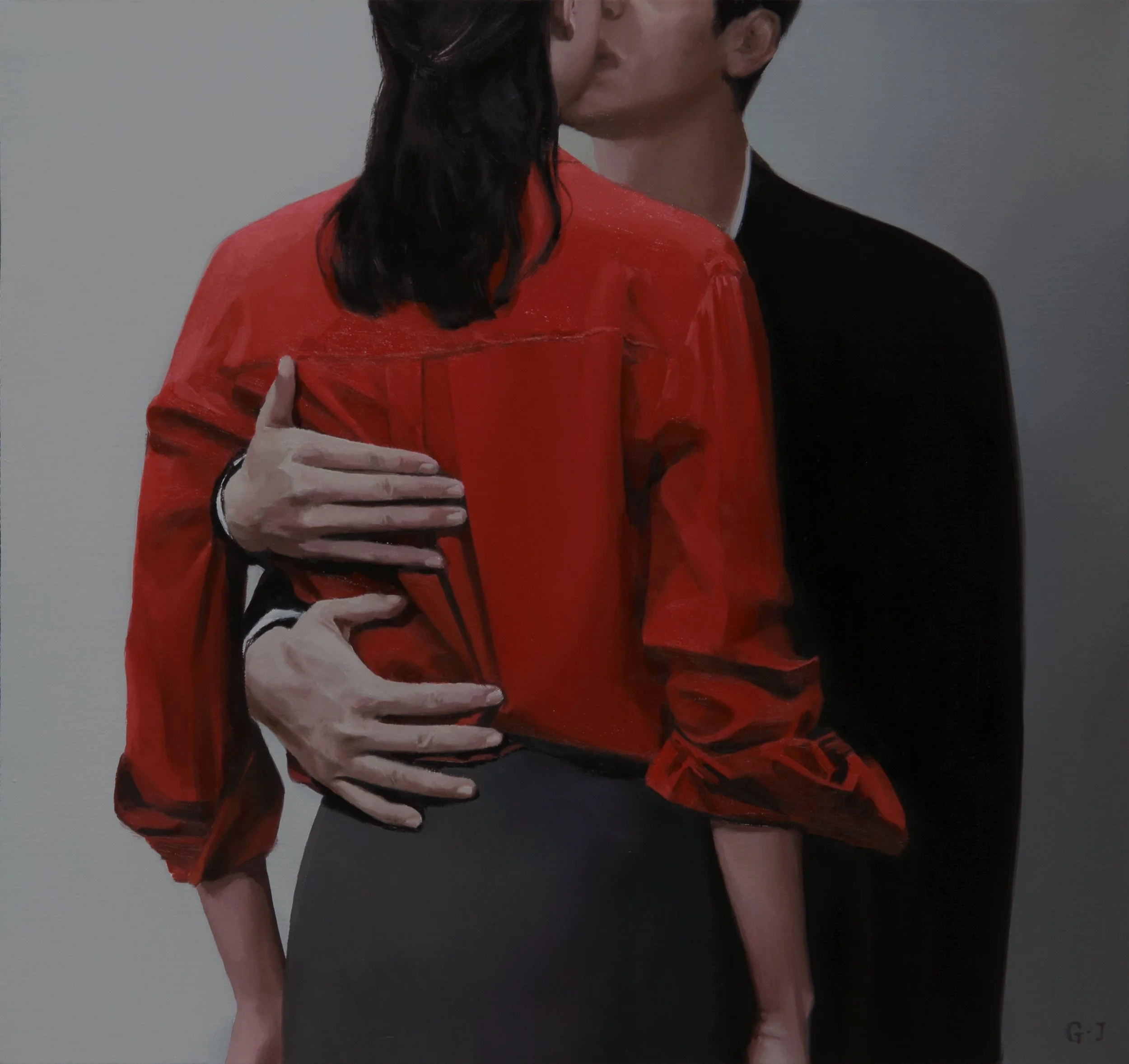 Frequently, in your paintings, the subject’s face is obscured—blocked by something, turned away from us, or simply cut off at the top of the frame. However, the hands are doing quite a lot. They grip, gesture, and caress. In “The Kiss”, the hand of a second, hidden lover seems to slyly cradle the woman’s back. Could you talk about your approach to figurative painting in these works?