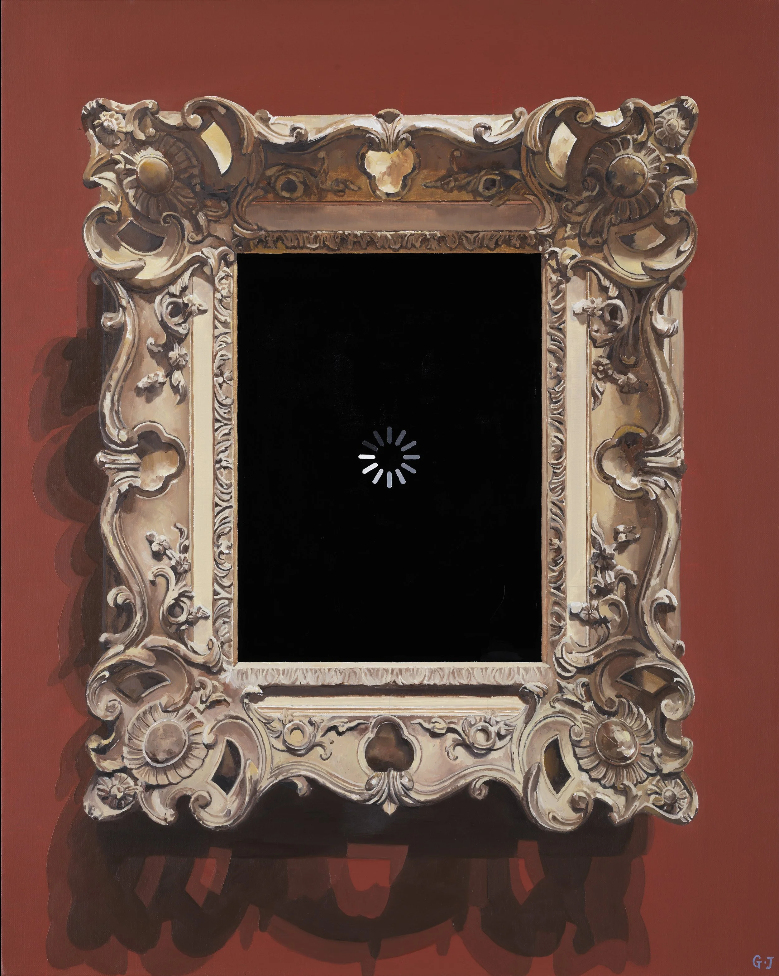 Several of your works depict the act of looking at art with sardonic wit. Viewers in a museum gawk at blank walls. In other paintings, there is something like a placeholder for a work of art, but it is only a spinning wheel to indicate the image hasn’t loaded, or an icon indicating the image failed to load. Yet the missing paintings within your paintings are set in rococo frames and protected by stanchions. What are you getting at with these works?